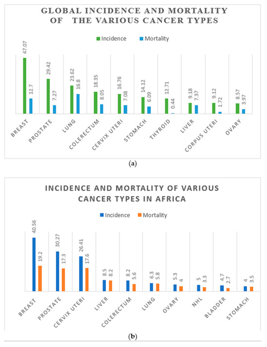 Despite reducing incidence and mortality rates for these cancers in some developed countries, the picture looks different in Africa. Even more worrying is that the mortality rates, respectively, increased marginally to 17.6 and 17.3 in Africa, which exceeded the world mortality rates by more than 2-fold (CC; 2.5-fold and PCa; 2.4-fold) (Figure 1a,b) [1].