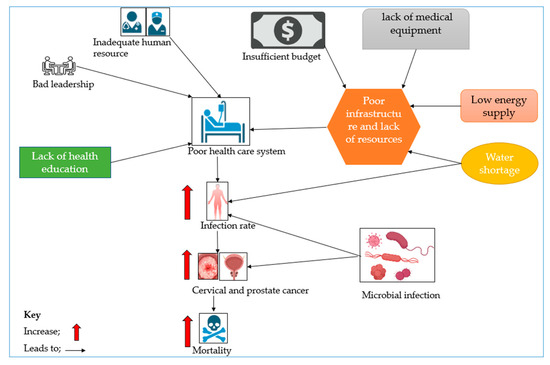 One potential factor linking microbial infection, CC and PCa, and poor healthcare systems in Africa is STIs, as noted under the infection agents in the cancer section. In Africa, STIs are prevalent due to multiple factors, including lack of health education, limited access to healthcare, and cultural factors that discourage people from talking about sexual health [72]. Further, lack of access to preventive measures such as testing and vaccinations, for instance, for HPV, as well as limited treatment options, can exacerbate the problem [73]. Poor healthcare delivery in Africa can also lead to delays, misdiagnoses and inadequate treatment for STIs and cancers, culminating in poorer health outcomes for individuals affected, thereby resulting in death, as illustrated in Figure 2. Together, inadequate human resources, low budgetary allocation, poor infrastructure, lack of health education, and bad leadership contribute to a flawed healthcare system, which is incapable of providing the necessary services like infection control; this results in increased infection rates contributing to CC and PCa, leading to an elevated mortality rate.