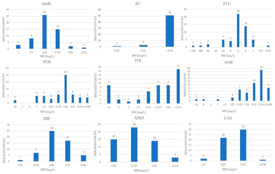 For caspofungin and micafungin, the MIC values took values of 0.06–0.5 mg/L and 0.16–0.25 mg/L, respectively, with MIC50 and MIC90 values of 0.125 mg/L and 0.06 mg/L, and 0.25 mg/L and 0.125 mg/L, respectively.
