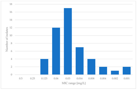 Regarding MGX, the microdilution method according to EUCAST was employed. Examination was limited to 49 isolates that showed sufficient growth in RPMI-1640 medium after 24 h of incubation. For manogepix, the MIC range varied from 0.001 to 0.125 mg/L, with an MIC50 of 0.03 mg/L and an MIC90 of 0.06 mg/L. The results for manogepix are presented in Figure 2.