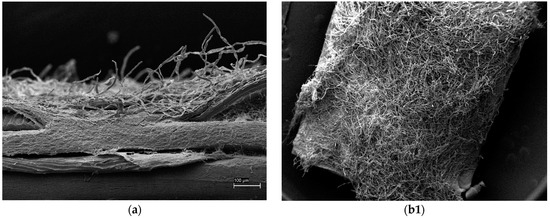 Scanning electron microscopy (SEM) of the skin sections of UDN-affected fish. (a,b1,b2) Very numerous mycelia were visible. The surface of the skin was completely covered with mycelium; therefore, the description of changes in epidermal cells was not feasible. (c) Locally, a lack of epidermal integrity and detachment of epidermal cells was observed. Detachable epidermal cells sometimes show damage/necrosis, and sometimes, cells with intact microridges are visible. (d) Visible in high-density traces of mucous cells—characteristic round holes. The cells around them have a changed surface—no microridges. (e) In some places, a significant reduction in the thickness of the epidermal layer and a developing mycelium was observed. (f,g) Visible blistering of epidermal cell microridges and mucous cell secretion accompanies epidermal damage/defects.