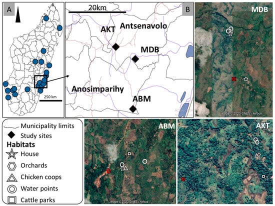 (A): The distribution of outbreaks of RVF in Madagascar, between 1 January 2021 and 25 November 2022, as reported to the WOAH through the early warning system [27]. (B): The locations of the three villages in the two municipalities of Antsenavolo and Anosimparihy and the five mosquito collection sites in each village. MDB: Madiolamba, ABM: Ambalamainty, and AKT: Ambodiakatra. A red star indicates a “house” habitat with a confirmed human case, and a red square indicates a “cattle park” habitat with a confirmed bovine case. The remaining habitats without confirmed human and bovine cases are white-colored.