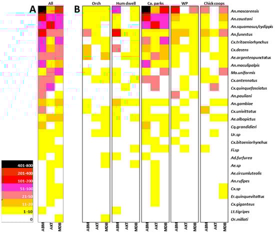 The abundance of mosquito species (in rows) collected by (A) site (ABM: Ambalamainty, AKT: Ambodiakatra, and MDB: Madiolamba) and (B) biotope (Orch: orchards and forest edges, Hum dwell: human dwellings, Ca. parks: cattle parks, WP: water points, and Chick coops: chicken coops).