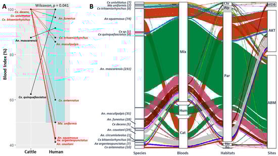 The analysis of blood meals. (A) The paired analysis of human and cattle blood indices (dots indicate the mosquito species; red lines represent the species that are predominantly zoophagic; and black lines indicate those that are predominantly anthropophagic). (B) Alluvial plots showing the changes in the number of engorged females for each species as a function of the type of blood meal (Cat: cattle, Hum: human, and Mix: mixed blood meals), habitat type (Fo: orchard, Ho: house, Par: cattle park, Wp: water point, and Chi: chicken coop), and site (ABM: Ambalamainty, AKT: Ambodiakatra, and MDB: Madiolamba). On the left-hand side of each block, the number of engorged females tested by species is indicated.