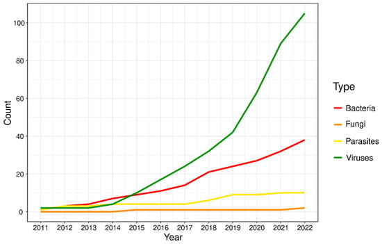 Cumulative number of studies using hybrid-capture target enrichment for human pathogens between 2011 and 2022.