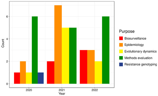 Number of studies (by year) investigating different aspects of SARS-CoV-2 using hybrid-capture target enrichment for sequence recovery between 2020 and 2022.