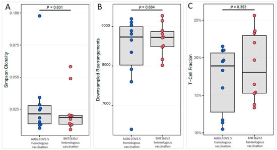 Box plot of T-cell receptor beta metrics reflecting the immune competency (A) Simpson clonality; (B) Downsampled rearrangements; and (C) T-cell fraction in two groups with the Ad26.COV2.S homologous vaccination (blue color) and with the Ad26.COV2.S–BNT162b2 heterologous vaccination (red color). Significant p-value was <0.05 using the Mann–Whitney test.