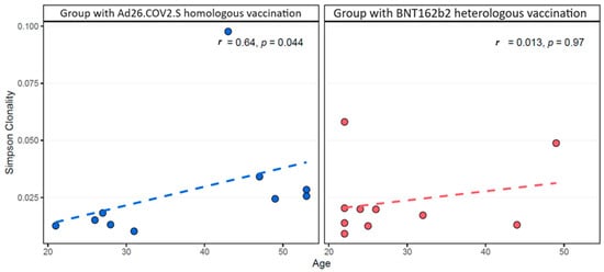 Spearman correlation of Simpson clonality of TCRβ rearrangements with the age of the group with the Ad26.COV2.S homologous vaccination (left, blue color) and of group with Ad26.COV2.S–BNT162b2 heterologous vaccination (right, red color). Positive correlation was detected in the former group with a statistically significant p-value < 0.05.