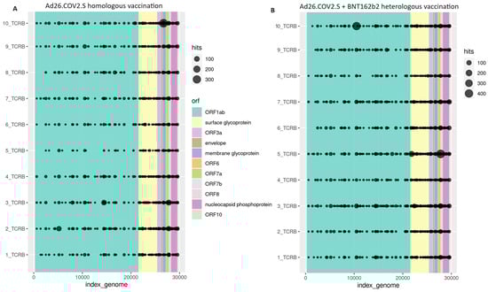 TCRβ rearrangements across the SARS-CoV-2 genome by sample from cohorts of individuals homologously vaccinated with the Ad26.COV2.S COVID-19 vaccine (A) and individuals heterologously vaccinated with the Ad26.COV2.S and BNT162b2 COVID-19 vaccines (B).