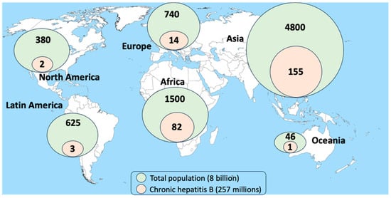Although protective HBV vaccines have existed for more than 40 years and HBV vaccination is recommended for all newborns, global coverage is suboptimal, especially in poor-resource countries [3]. Asia and Africa are the regions with the largest number of patients with chronic hepatitis B (Figure 2). Approximately a half live in three countries: China, India, and Indonesia [1]. In Western countries, migration flows from HBV-endemic regions largely account for most new chronic hepatitis B diagnoses [2,3]. In addition, HBV immunity waning might be more common than expected and explain the high rate of HBV-susceptible adults in countries with proper HBV vaccination policies [4]. The WHO estimates that 1.5 million new HBV infections occur annually worldwide [2].
