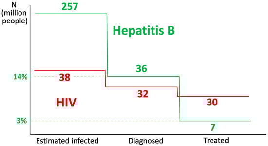 The WHO set up in 2016 a plan to eliminate viral hepatitis as a major public health threat by 2030, proposing specific targets that include a 90% reduction in new diagnoses of chronic hepatitis B, 80% antiviral treatment coverage, and a 65% reduction in mortality due to HBV [8]. Up to 2024, only 36 (~14%) out of the 257 million people estimated to live with chronic hepatitis B have been diagnosed. Furthermore, only 7 million (~3%) are under antiviral treatment, and it is unknown whether this proportion is virally suppressed. Thus, the cascade of care for HBV is clearly behind the one for HIV/AIDS (Figure 3), for which the WHO has set up 95-95-95 goals for diagnosis, treatment, and suppression by 2030 [8].
