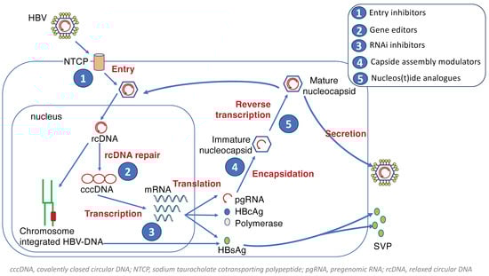 - Nasser, N.; Tonnerre, P.; Mansouri, A.; Asselah, T. Hepatitis B virus: Replication cycle, targets, and antiviral approaches. Curr. Opin. Virol. 2023, 63, 101360. [Google Scholar] [CrossRef] [PubMed]