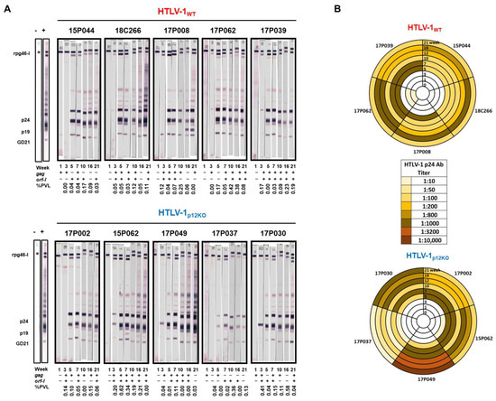 Antibody responses. (A) Sera from the inoculated macaques belonging to HTLV-1WT and HTLV-1p12KO groups were assayed at weeks 1, 3, 5, 7, 10, 16, and 21 for reactivity to HTLV-1 antigens using the kit from HTLV Blot 2.4 Western Blot Assay (MP Diagnostics, Singapore). The animal ID, inoculated viruses, and treatment are indicated above each sample. The week of serum collection is indicated below each Western blot strip. Nested PCR amplifying the gag and orf-1 genes and qPCR for the assessment of HTLV-1 proviral load were performed in the DNA isolated from the PBMCs of each animal throughout the course of the study (see Material and Methods) and are indicated below each Western blot strip. The positive amplification of either gag or orf-1 is symbolized by (+); the absence of amplification is symbolized by (-); the PVL is shown as the number of HTLV-1 proviral DNA copies per 100 PBMCs. (B) The serum HTLV-1 p24Gag antibody titer was measured for macaques belonging to the HTLV-1WT (top panel) and HTLV-1p12KO (bottom panel) groups at weeks 1, 3, 5, 7, 10, 12, 16, and 21. Dilutions of 1:10, 1:50, 1:100, 1:200, 1:800, 1:1000, 1:3200, and 1:10,000 were used and color-coded as reported in the figure.