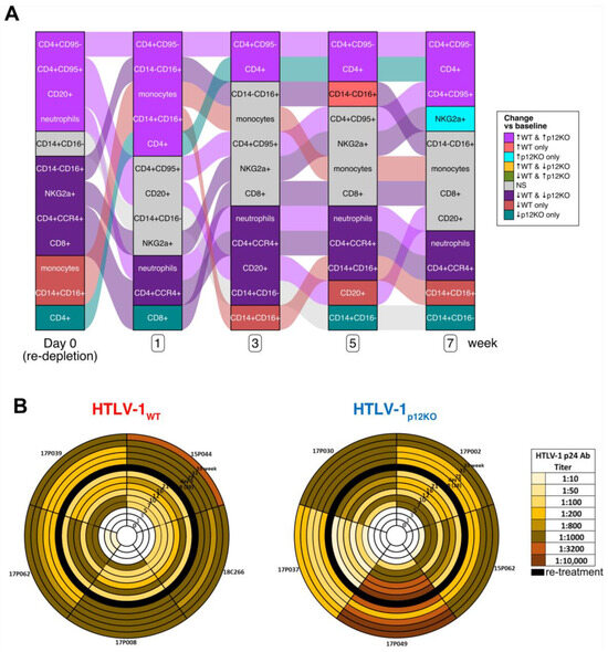 Cell populations and sero-reactivity in HTLV-1WT- and HTLV-1p12KO-infected macaques after re-depletion with M-T807R1/Clodrosome. (A) Alluvial plot illustrating the changes in CD8+ and CD4+ T-cell, B-cell (CD20+), and monocyte cell counts and the frequency of the three monocyte subsets (classical (CD14+CD16−), intermediate (CD14+CD16+) and non-classical (CD14−CD16+)), as well as NKG2a+ cells and neutrophils from whole blood of HTLV-1WT (WT) and HTLV-1p12KO (p12KO) infected animals, given for day 0 (re-depletion) and weeks 1, 3, 5, and 7 after re-treatment with M-T807R1/Clodrosome. Paired analysis fitting generalized estimating equations (geeGLM) determined that the cell populations significantly changed over time in each group. Statistical results are represented by ↑ for increase (p < 0.05), ↓ for decrease (p < 0.05), and NS for not significant (p ≥ 0.05). Each column is sorted according to the pattern of significant changes over time across the groups indicated. These patterns are represented by colors as described (legend at right of the plot). Streams (alluvia) between columns highlight the significance/direction pattern over time for each cell type and are colored according to the pattern on day 0 (re-depletion) vs. baseline (leftmost column). Timepoints and groups are shown below the graph. (B) The HTLV-1 p24Gag antibody titer was measured in macaques belonging to the HTLV-1WT (left) and HTLV-1p12KO (right) groups at weeks 1, 3, 5, 7, 10, 12, 16, and 21 and after re-treatment at week 28 (baseline, B); day 0; and weeks 29, 31, and 33. Black circles represent the starting point of re-treatment with M-T807R1/Clodrosome. Dilutions of 1:10, 1:50, 1:100, 1:200, 1:800, 1:1000, 1:3200, and 1:10,000 were used and color-coded as reported in the figure.