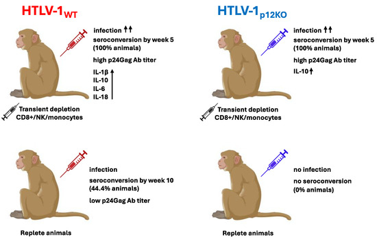 Model of HTLV-1 infection in macaques. A diagram illustrating virus–host responses in transiently triple-depleted (top) or replete (bottom) animals is shown. Treatment of macaques with M-T807R1/Clodrosome (black syringe) to deplete CD8+, NK cells, and monocytes prior to intravenous infection with HTLV-1WT (red) or HTLV-1p12KO (blue) resulting in seroconversion, detection of PVL, and high p24Gag antibody titers in 10 out of 10 animals. Completely restoring HTLV-1p12KO infection. While viral parameters were similar in the two groups, a difference in cytokine/chemokine profiles was measured. In contrast, in untreated/repleted animals, the HTLV-1p12KO virus could not sustain infection, with no seroconversion or detection of PVL. HTLV-1WT infection occurred in 44% of repleted animals, with delayed seroconversion and low p24Gag antibody titers. The ↑↑ indicates increased infectivity (100%). The ↑ signifies high plasma levels of indicated cytokine.