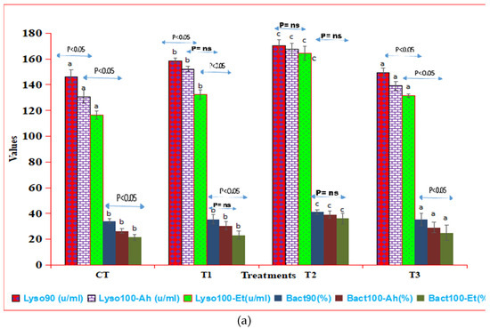 The feed experiment showed significant variations in immune parameters (Lys90, Bact90, NBT90) among treatment groups. Treatment 2 (T2) notably increased these parameters compared to CT and Treatment 1 (T1), while Treatment 3 (T3) decreased significantly. In the challenge study, both CT and T3 exhibited declining trends from 90 to 100 days, unlike T2, which remained stable. This pattern persisted in the challenge study involving Aeromonas hydrophila (Ah) and Edwardsiella tarda (Et), as depicted in Figure 2a,b. The consistent performance of T2 in maintaining stable values suggests its potential efficacy in enhancing resistance against these pathogens. Linear regression analysis revealed significant relationships between measured parameters and treatment duration. For NBT in T2, the regression equation was: