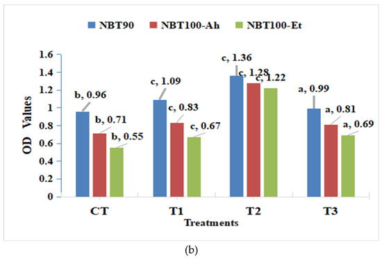 (a) Humoral responses in indoor feed trial and challenge study. The superscript indicates the significance between and among the treatments, whereas the arrow mark indicates the variation within the treatments before challenge and after challenge study. Here, Lys90 and Bact90, represent the values of lysozyme activity and bactericidal activity at 90 days of feeding trial. Suffix100, along with these three parameters, indicates challenge study with two pathogenic bacterial isolates, Et (Edwardsiella tarda) and Ah (Aeromonas hydrophila) at 100 days (10 days duration, 90–100 days). (b) Respiratory burst activity responses by NBT in indoor feed trial and challenge study. The superscript indicates the significance between and among the treatments, whereas the arrow mark indicates the variation within the treatments before challenge and after challenge study. Here, NBT 90 represents the values of respiratory burst activity at 90 days of feeding trial. Suffix100 indicates challenge study with two pathogenic bacterial isolates, Et (Edwardsiella tarda) and Ah (Aeromonas hydrophila) at 100 days (10 days duration, 90–100 days).
