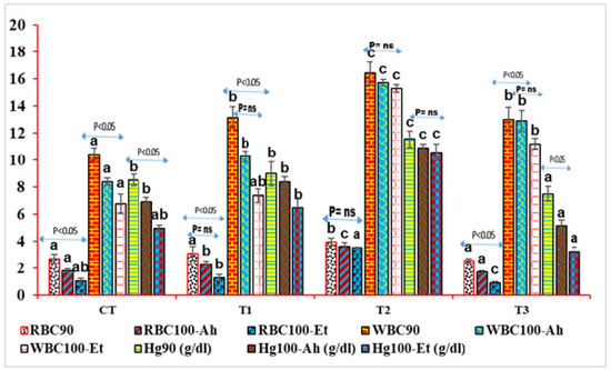 Table 2 shows that hematological parameters, including hematocrit (%) at 90 days (HCT90), mean corpuscular volume at 90 days (MCV90), mean corpuscular hemoglobin at 90 days (MCH90), and platelets at 90 days (PLT90), exhibited a substantially (p < 0.05) increasing trend in Treatment 2 (T2) when comparing feed treatments to challenge studies with Aeromonas hydrophila (Ah) and Edwardsiella tarda (Et).