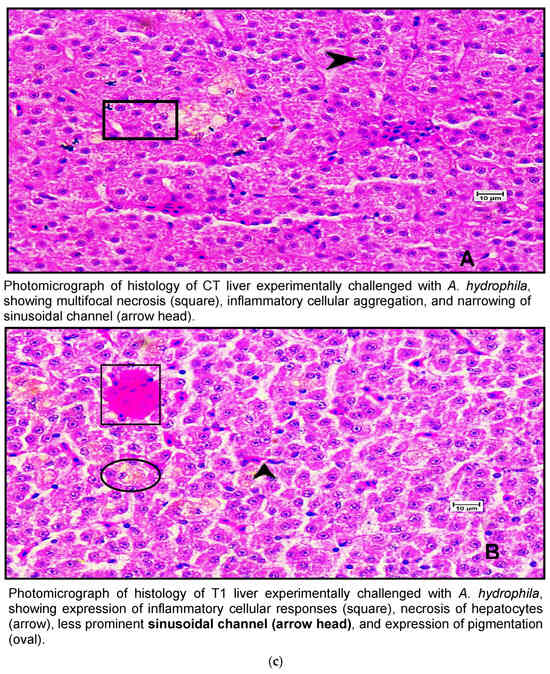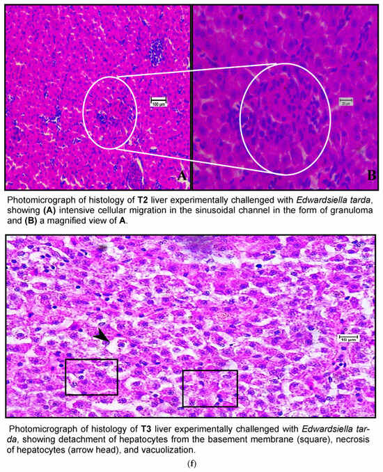 (a) A photomicrograph of the livers of CT and T1 groups. (b) A photomicrograh of the livers of T2 and T3. (c) A photomicrograph of the livers of CT and T1 groups challenged with A. hydrophila. (d) A photomicrograph of the livers of T2 and T3 groups challenged with A. hydrophila. (e) A photomicrograph of the livers of CT and T1 infected with E. tarda. (f) A photomicrograph of the histology of the liver of T2 and T3 infected with E. tarda.