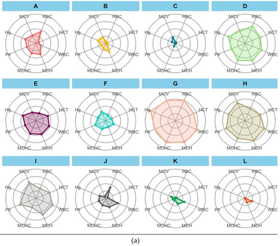 In this study, experimental groups are labeled with letters: A, B, and C represent the CT group, while D, E, and F stand for T1, G, H, T2 is denoted by I, and J, K, and L represent T3. This classification aids in comparing and analyzing different treatments’ effects on biomarkers. The integrated biomarker response (IBR) star plot method is used to assess biomarkers’ status visually. Each biomarker is represented by spokes extending from a central point, with length and direction indicating magnitude and change direction, respectively (Figure 8a). Examining the IBR star plot reveals distinct patterns across groups. The CT group shows a prevalence of spokes for RBC count and a larger plotted area except for WBC count and HCT. T1 displays sharper spikes and an expanded area, especially for erythrocyte parameters. Conversely, T2 exhibits the most pronounced spikes and area, suggesting a heightened biomarker response. Interpreting the plot provides insights into fish physiological status. For instance, upward-pointing WBC count spokes indicate stress, while downward-pointing spokes suggest reduced levels. When multiple biomarkers show divergent changes, their relative IBR values become crucial. Overall, group G demonstrates the healthiest hematology parameters, highlighting the IBR star plot’s utility in understanding treatment effects on fish physiology and identifying potential stressors in aquatic environments.