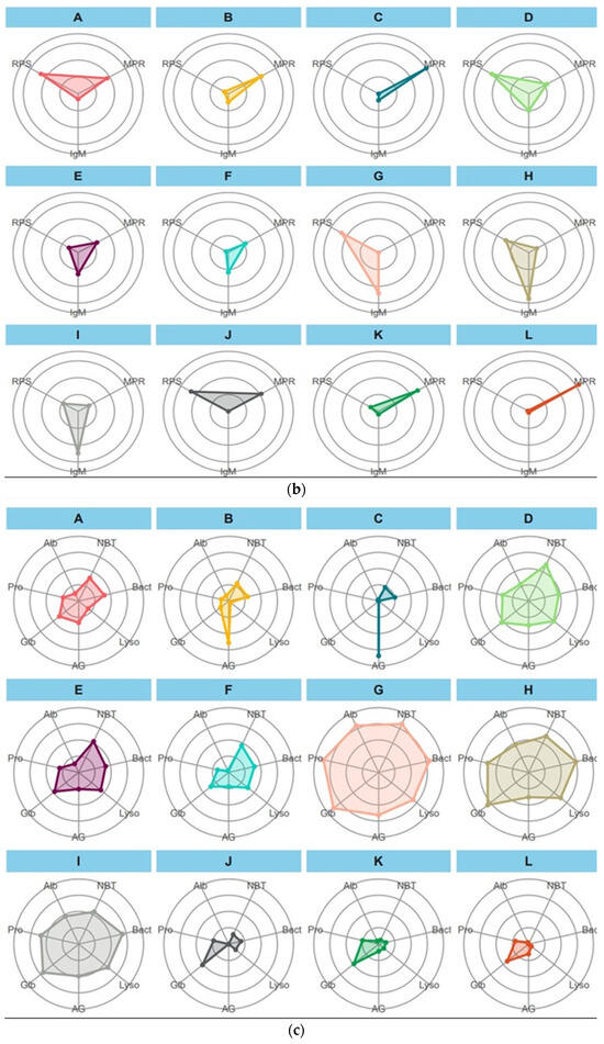 (a) IBR star plot of hematological markers. Here, A: CT90, B: CT100ah, C: CT100et, D: T190, E: T1 100ah, F: T1 100et, G: T2 90, H: T2 100ah, I: T2 100et, J: T3 90, K: T3 100ah, L: T3 100et, RBC—red blood cell, WBC—white blood cell, HCT—hematocrit, Hg—hemoglobin, MCV—mean corpuscular volume, MCH—mean corpuscular hemoglobin, PLT—platelets, and MCHC—mean corpuscular hemoglobin concentration. The experiment was conducted for 90 days as an indoor feed trail and then followed by a challenge study with two bacterial isolates, Aeromonas hydrophila and Edwardsiella tarda. (b) IBR star plot of adaptive immunity markers. Here, A: CT90, B: CT100ah, C: CT100et, D: T190, E: T1 100ah, F: T1 100et, G: T2 90, H: T2 100ah, I: T2 100et, J: T3 90, K: T3 100ah, L: T3 100et, RPS—relative percentage survival, MPR—microprotein, IgM—immunoglobulin. (c) IBR star plot of serum markers. Here, A: CT90, B: CT100ah, C: CT100et, D: T190, E: T1 100ah, F: T1 100et, G: T2 90, H: T2 100ah, I: T2 100et, J: T3 90, K: T3 100ah, L: T3 100et, ALB—albumin, NBT—nitroblue tetrazolium test, Lyso—lysozyme activity, Pro—protein, Glb—globulin, Bact—bactericidal activity, AG—albumin–globulin ratio.