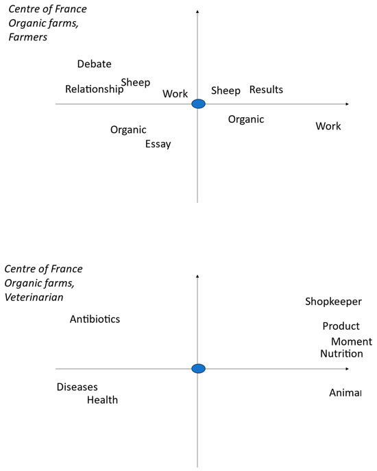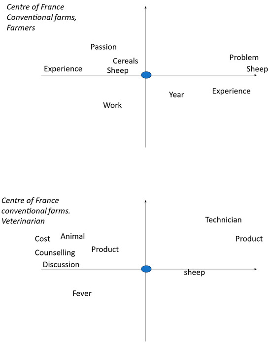 The interviewers (J.C. and N.C.) asked the farmers open questions, as described by Hughes [33]. These questions had been preprepared in an interview guide, which was identical for all interviews (Supplementary Data S1). The interview guide for the dairy plant, chambers of agriculture, and cooperative technicians was adapted from the farmers’ guide. The recorded interviews were transcribed into a Word text. All the texts from one group of farmers were concatenated before analysis. Tropes (V8.5) [34] speech/discourse analysis software was first used to process the data for the cognitive analysis of the interviews [35], which were then analysed using the multivariate method [36] applied to the most frequently used words in the interview. The difference between discourse analysis in our study and text linguistics is that discourse analysis aims at revealing sociopsychological characteristics of a farmer rather than this text structure. Significant differences in the word’s occurrences between farming types were assessed using two-tailed Z score statistics for two populations; where the proportions were low (less than 4%), Fisher’s exact test was applied to the number of occurrences for each word. Technical questions on GIN management (type of anthelmintic treatment, frequency, and pasture use) were asked separately when they were not spontaneously provided during the interview. We built a grid and codes from manually analysing farmers’ speech: importance of strongyle infection; number of treatments; use of selective treatments, of natural (mostly plants or essential oils of plants) or synthetic anthelmintics; choice of anthelmintics; Is there a visible effect of the treatment? Is the veterinarian an important advisor in relation to GINs? Is resistance to anthelmintics present in the farm? Is it imported from elsewhere? According to the speech and answers of the farmers, we translated the information into semiquantitative variables. We coded these variables from one (low) to three (high). For example, quantitative data like the number of treatment were coded as follows: 1—no treatment, 2—once/twice a year, 3—more than twice a year. Qualitative data like the use of natural or synthetic anthelmintic were coded as follows: 1—natural, 2—both, 3—synthetic only. The variables were subjected to centroid cluster analysis using nonparametric Spearman correlation coefficients. The centroid analysis used average linkage, which was a balanced approach to clustering. The centroid of each group was calculated and the distance between the groups was the distance between centroids.