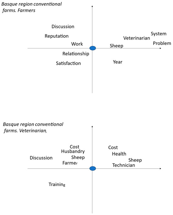 Sheep was the most used word, used followed by farmer (58.1% of the word occurrences in the Basque region) and veterinarian (13.3% in the conventional farms of central France), which is not surprising since the interviews were related to sanitary problems. The role of farmer was apparently more important (organic central France and Basque region) than the one of the veterinarians, or equal (conventional farms from central France). The presence of technician, parent, or peer/neighbour was also acknowledged by all farms. The word parent was most used among conventional farmers of central France in relation to their rural origin (proximity and inheritance of farms from parents). Shepherd (21.1% of occurrences) and mountain (17.8% of occurrences) were highly present for the farmers of Basque region due to the use of transhumance towards Pyrenees mountains and the necessity of shepherds to manage the flock on extensive pastures. The word parasite and treatment were frequent in the interviews of organic farmers because they first used alternatives, and then synthetic anthelmintics.