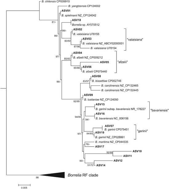 For phylogenetic analysis, we used 49 V4 16S sequences (Table S1), including ASVs found in this study (n = 18), V4 16S sequences identical to the ASVs found in this study and sourced from reference B. burgdorferi s.l. genomes deposited in GenBank (n = 18), and representatives of Borrelia RF group (n = 13) used to root the tree. Sequences were aligned manually in GeneDoc. The final alignment of 253 nucleotide positions was used to construct phylogenetic trees, which were built using FastTree 2.1.11 and MrBayes 3.2.6, both using the GTR+G model, as implemented in Geneious Prime 2023.2.1 (Biomatters Ltd.). Statistical supports for branches were estimated by Shimodaira–Hasegawa test (SH) [30] and Bayesian posterior probability (PP). Trees were edited in Mega7 [31] and Corel Draw v. X5.