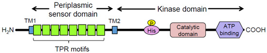 Domain organization of the FimS sensor histidine kinase. TPR, tetratricopeptide repeat. Eight TPR motifs are predicted by TPRpred [10] to be clustered in the periplasmic sensor domain of FimS. TM1/2, transmembrane helices.