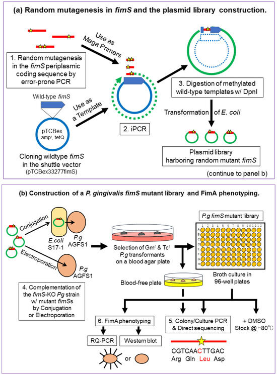 Strategy for random mutagenesis in the FimS periplasmic-domain-coding sequence. (a) Step 1, amplification of the 1.1 kb periplasmic coding sequence harboring random mutations (indicated as stars) by error-prone PCR. Step 2, exchange the wild-type sequence with the mutant using inverse PCR (iPCR). Step 3, digestion of methylated wild-type template plasmid with DpnI. (b) Step 4, complementation of the fimS-knockout (KO) P. gingivalis strain, AGFS1, with the mutant plasmid (iPCR products) by conjugation or electroporation. Step 5, screening of amino acid-substituted FimS clones by colony/culture PCR and direct sequencing. Step 6, FimA phenotype analyses (RQ-PCR and Western blotting).