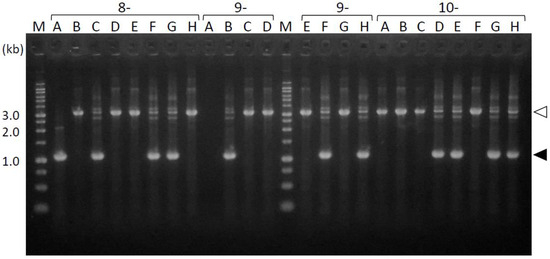 PCR amplicons of the fimS periplasmic-domain-coding sequences from the complemented AGFS1 colonies. The amplicons from clones 8A–10H are shown as examples. The 1.1 kb fragments (closed arrowheads) were amplified from the expression plasmids. The 3.3 kb fragments (open arrowheads) were derived from the endogenous fimS locus into which a 2.2 kb erythromycin cassette was inserted. M, ladder marker.