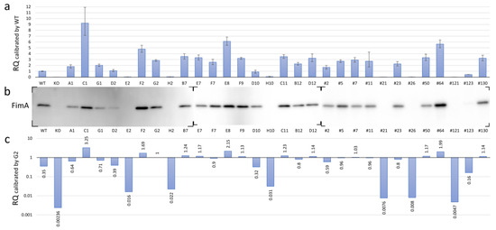 Pg modulates the expression of all components of the FimA fimbriae by receiving unknown environmental signals through the TCS protein FimS. To investigate the phenotypic changes in the FimA fimbriae caused by amino acid substitutions within the periplasmic domain of FimS, we measured and compared the transcriptional levels of fimA in the fimS-complemented AGFS1 strains using RQ-PCR analysis. When the expression level was calibrated with that of the wild-type strain, at least four strains (C1, F2, E8, and #64) showed increased levels of fimA expression, whereas seven strains (E2, H2, H10, #21, #26, #121, and #123) showed significantly decreased levels of fimA expression (Figure 4a and Table 3). Subsequent Western blot analysis supported the initial RQ-PCR results at the translational level; the signal of the FimA protein was not detected or was only detected at trace levels in strains E2, H2, H10, #21, #26, #121, and #123 (Figure 4b). However, paradoxically, many strains showed higher transcriptional levels of fimA than the wild type with inconsistent production levels of the FimA protein (Figure 4a,b). Strain G2 was an iPCR amplicon-transformed strain in which no amino acid substitution was observed in the complemented fimS on pTCBex. Thus, this strain was treated as another wild-type fimS strain for comparison. Interestingly, the relative transcriptional level of fimA in strain G2 was approximately 2.8 times greater than that of the wild-type strain (Figure 4a), which is likely attributed to the difference between the copy number of fimS from chromosomal DNA and the multicopy pTCBex plasmid. When the RQ-PCR data were recalibrated with strain G2, the expression levels during transcription and translation were consistent (Figure 4b,c). Therefore, we assumed that the RQ value of approximately 3 in the wild-type calibration corresponded to that of 1 in the G2 calibration and concluded that the hyper-fimA strains with values 1.5 times or greater than that of strain G2 were C1, F2, E8, and #64, whereas the hypo-fimA strains with a value half or less than that of the wild-type strain were E2, H2, H10, #21, #26, #121, and #123.