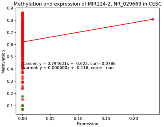 The methylation testing of Cervical Squamous Cell Carcinoma and Endocervical Adenocarcinoma (CESC)’s FAM19A4 and hsa-miR124-2 was conducted using the MethHC version 2.0 platform, released in 2021, which has counted 27,190 DNA methylation data points, 1732 expression data points, and 11,196 microRNA data points in 33 different types of tumors. The data on the methylation and expression of hsa-miR124-2 in CESC are shown in Figure 3; the plot shows its methylation on the y axis and its expression on the x axis. The level of hsa-miR-124-2’s expression in normal tissue is the baseline, and it increases up to 0.2 in CECS. The KEGG analysis of hsa-miR-124-2, which highlighted its importance in cancer pathways, is present in the Supplementary Materials (Figure S1). No data are reported for FAM19A4, even when searching for it in the MethHC version 2.0 platform using the alias TATA4, or in KEGG.