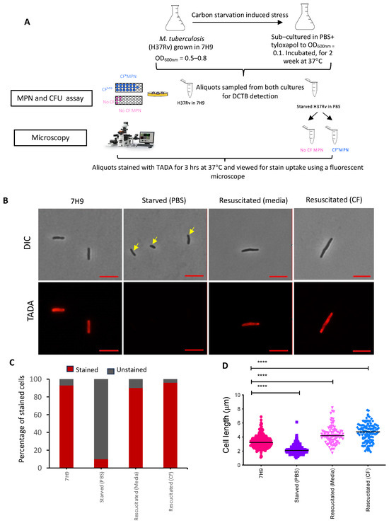Generation of DCTB in H37Rv using an in vitro carbon starvation model. (A) Schematic diagram showing the conditions for carbon starvation of H37Rv and downstream assessment for the detection of DCTB. The DCTB population in H37RV grown in 7H9 media and starved in PBS was detected by the MPN and CFU assays, followed by the assessment of the resuscitated cells (with media and CF), starved and axenic cells by microscopy. (B) Microscopy of stained starved cells before and after resuscitation with and without CF compared to an axenic culture of H37Rv grown in 7H9 media. (C) Assessment of culturability of cells under the different culture conditions. Up to one hundred TADA-stained cells from each of the culture conditions were assessed for the proportion of stained and unstained cells under a fluorescent microscope. (D) Comparison of cell length differences for the unstarved, starved and resuscitated cells. The scale bar represents 2 µM. A one-way ANOVA test showed that the starved H37Rv cells were significantly shorter (**** = p-value ≤ 0.0001) compared to the resuscitated cells which were significantly longer than the cells grown in 7H9 (**** = p-value ≤ 0.0001).