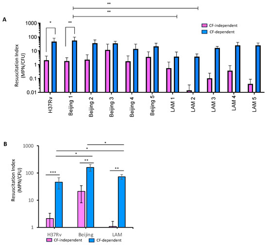 Assessment of the propensity of the clinical Beijing and LAM isolates to produce DCTB. (A) Each of the 5 Beijing and LAM strains and the H37RV control laboratory strain were starved in PBS for two weeks, after which DCTB from each culture were resuscitated with media and CF from H37Rv. The resuscitation index was calculated using the MPN/CFU ratio. The experiment was performed in triplicate. T-test analysis showed that both Beijing and LAM strains resuscitated significantly more CF-dependent DCTB compared to resuscitation with media (p-value ≤ 0.01). (B) Average DCTB resuscitation index for the 5 Beijing and 5 LAM strains. * = p-value < 0.05, ** = p-value < 0.01 and *** = p-value < 0.001 All three genotype families demonstrate greater resuscitation of the starved strains with CF compared to media (p-value ≤ 0.001–≤0.01) with no difference in resuscitation between the Beijing and LAM families (p-value ≤ 0.01).