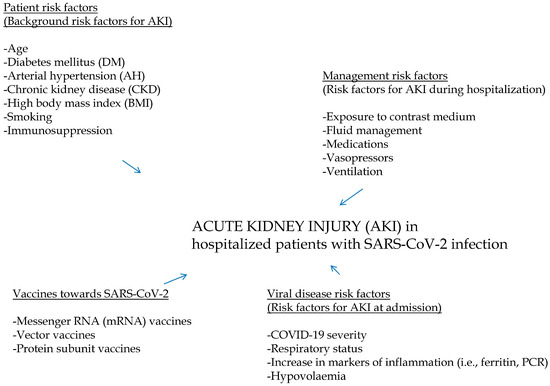 Acute kidney injury appears to be a common complication at the kidney level in patients with SARS-CoV-2 infection, and its pathogenesis has clearly multifactorial nature. Various factors play a pivotal role on the risk of AKI in patients with SARS-CoV-2 infection. Some factors (such as vaccines against SARS-CoV-2) reduce the frequency of AKI in SARS-CoV-2-positive patients, while others (factors associated with the viral disease per se or factors linked to the management of SARS-CoV-2 or demographic/clinical parameters) appear to increase the risk of AKI in the same population (Figure 1).