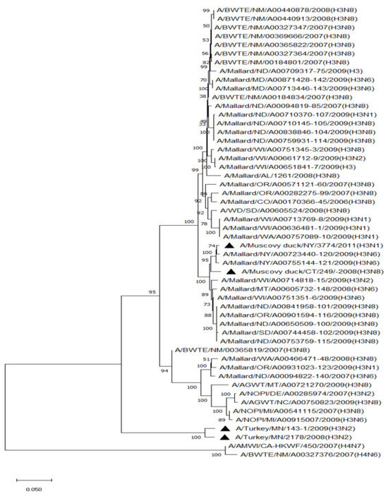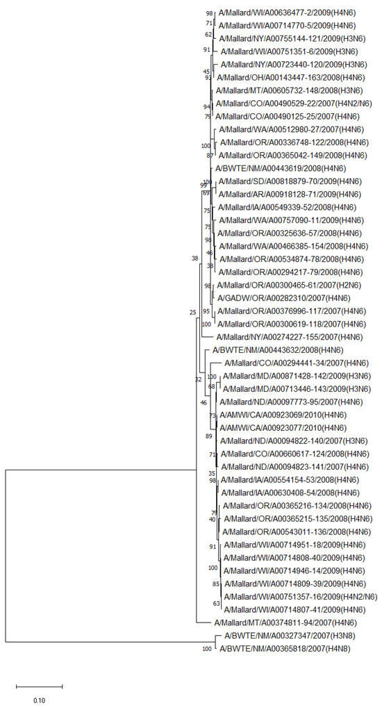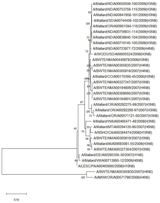33. Chander, Y.; Jindal, N.; Stallknecht, D.E.; Sreevatsan, S.; Goyal, S.M. Full length sequencing of all nine subtypes of the neuraminidase gene of influenza A viruses using subtype specific primer sets. J. Virol. Methods 2010, 165, 116–120. [Google Scholar] [CrossRef] [PubMed]