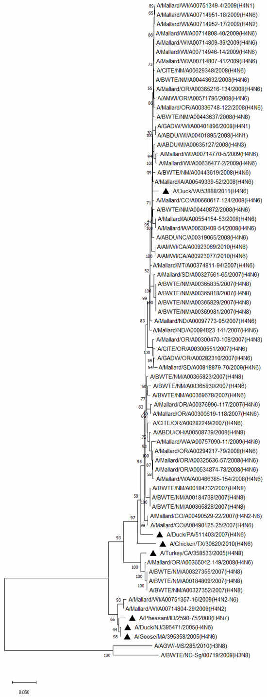 Figure 2. Phylogenetic relationships among H4 low pathogenic avian influenza virus isolates from non-mallard and mallard migratory waterbirds and poultry in the United States (2006–2011) based on HA sequences. Phylogenies were inferred using the maximum likelihood method with 100 bootstrap replicates for the viruses. Numbers at the nodes represent bootstrap values. Poultry isolates are indicated by a black triangle. Two H3 sequences were used to root the phylogenetic tree.
