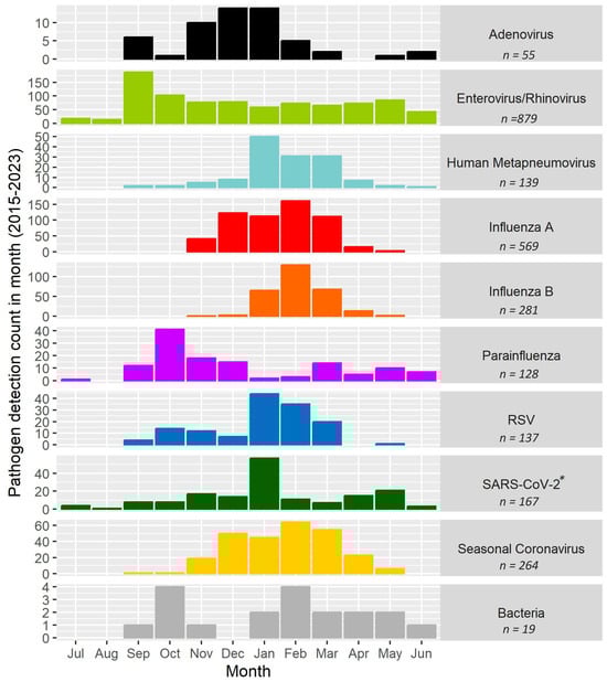 We used a 1 July through 30 June temporal format for graphics to correspond to the seasonality of respiratory viruses. The results were described as means (±standard deviations) and medians calculated using standard statistical methods. For comparisons of median ages based on pathogens, we used the Kruskal–Wallis test. For post hoc, pairwise comparisons, we used Dunn’s test with a Benjamini–Hochberg correction of the p-values to maintain the false discovery rate at 5%. Analyses were performed using R, version 4.32.0.