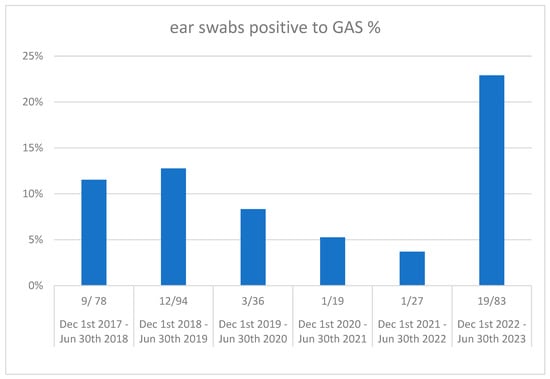 Using the chi-squared test, we also compared the proportion of GAS-positive ear swabs during the 2022–2023 season with the overall proportion for the previous five seasons (GAS-positive swabs in the five seasons divided by total swabs in the same period), which revealed a significant percent increase in the 2022–2023 season (23% vs. 10%, p < 0.01).