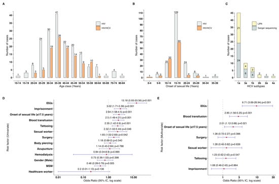 Epidemiology of HCV infection in patients with HIV. Prevalence of HIV and HIV/HCV co-infection by (A) age and (B) onset of sexual life. (C) Distribution of HCV subtypes in HIV population. The forest plots show the main risk factors associated with HIV/HCV co-infection based on (D) univariate and (E) multivariate analysis. HCV: hepatitis C virus, HIV: human immunodeficiency virus, OR: odds ratio, CI: confidence interval, and LiPA: line probe assay.