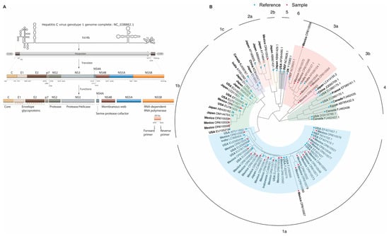 HCV genomic map and the phylogenetic tree utilized for HCV subtyping. In panel (A), the complete length of the HCV genome is displayed alongside its primary transcript. This transcript encodes a polyprotein, which undergoes fragmentation to produce the main viral proteins. The pink fragment indicates the specific region utilized for HCV subtyping in this study. Panel (B) presents the phylogenetic tree, with sequences labeled by country and GenBank accession number. Blue dots indicate reference samples, while study samples are highlighted in red.