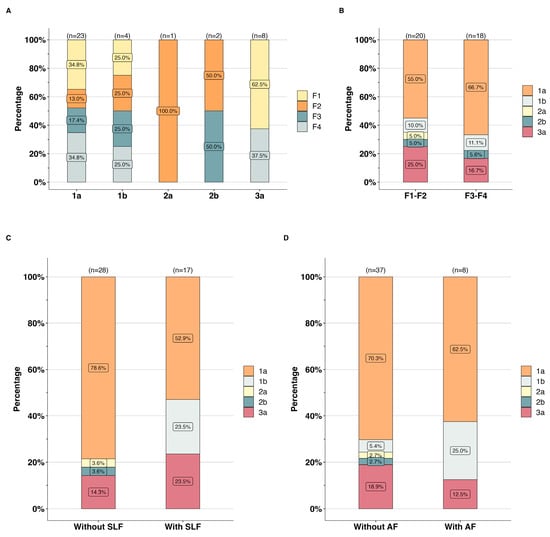 (A) Liver fibrosis degree by HCV subtypes in patients with HIV. Distribution of HCV subtypes among patients with (B) advanced liver fibrosis (F3–F4), (C) significant liver fibrosis (SLF), and (D) advanced fibrosis (AF).
