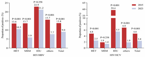 In 2023, there were 1.26 million people living with HIV in China [1]. According to modeling studies, China has the highest rate of hepatitis B virus (HBV) and hepatitis C virus (HCV) infections [2,3]. The number of HBV-positive individuals in China reached 79,747,000 in 2022, while the number of HCV-positive individuals in China reached 2.3 million in 2020, and 9.487 million people have HCV worldwide [2,3]. In 2016, the WHO set the target of eliminating HIV, HBV, and HCV as a public health threat by 2030. In 2021, nine organizations in China, including the National Health and Health Commission of the People’s Republic of China, released the “Work Program for Action to Eliminate Public Health Hazards of Hepatitis C (2021–2030)”. Since then, the prevention of HIV, HBV, and HCV has attracted more and more attention. Additionally, HIV/HBV and HIV/HCV co-infections were reported to accelerate HIV disease progression and high antiretroviral therapy-related deaths compared to mono-infected individuals [4,5,6]. The early combining of diagnosis and treatment, risk behaviors and reduction strategies, and the hepatitis B vaccine are effective to eliminate HBV and HCV in people living with HIV [7,8,9].