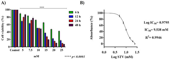 Figure 1. Effect of STV on trophozoites of E. histolytica viability. (A) mM STV concentrations: 5 and 7.5 mM displayed viability but recovered after 24 h; 10 mM concentration had amoebostatic effect up to 12 at 48 h exposition; higher concentrations than 15 mM showed a toxic effect. (B) IC50 STV 9.53 mM was concentration used in all experiments to evaluate effect of STV on trophozoites. Values are the means and SD in triplicate of three independent experiments. The date showed a significant difference **** p < 0.0001 with respect to control.