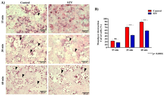Figure 5. Cytopathic effect of E. histolytica trophozoites exposed to STV. (A) H&E staining of cell monolayers exposed to trophozoites treated at different times by STV; a greater destructive capacity can be observed in control conditions than with treated amoebae. (B) The quantification of methylene blue retained in the remains of monolayers that were exposed to the treated and non-treated trophozoites demonstrates the significant decrease in the cytopathic effect when there was exposure to STV. Arrow heads point to lytic zones. Values are the means and SD in triplicate of three independent experiments. The date showed a significant difference **** p < 0.0001 and “ns” indicates that there is no significant difference with respect to the control.