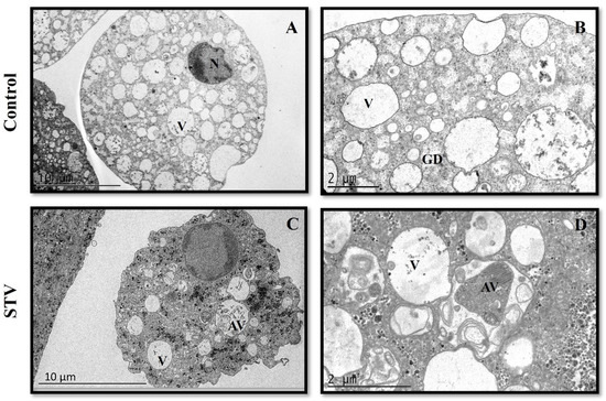 The analysis of the ultrastructure of normal trophozoites shows a regular cytoplasmic membrane, with glycogen deposits, vacuoles without content, and typic nuclei (Figure 8A,B). The STV-treated parasites showed an irregular-appearing plasma membrane, and a decrease in the number of vacuoles was observed, most of which had cellular debris such as cytoplasmic fragments, granular content, and broken membranes. The cytoplasm was shown to be more electron dense and with an increase in the cellular granularity of unknown origin, while the nucleus showed a similar appearance to the control group (Figure 8C,D). Those results suggest that the presence of membrane and cytoplasmic content inside the vacuoles could be linked to an autophagic process derived from STV exposure.