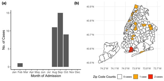 (a) Bar plot demonstrating frequency of month of admission among WNND patients. Bars represent the absolute count of patients presenting in each month. (b) Distribution of cases within New York City. Grey lines indicate the outlines of zip codes within New York City, with shading indicating the number of patients with home addresses in each zip code. Not shown are 3 zip codes in New Jersey (07010, 07701, 079101) with one case and 1 zip code in Yonkers with 2 patients (10704).