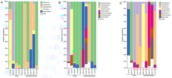 Microbiota composition of each sample. Samples are stratified according to the analyzed group: (A) top five bacterial phyla; (B) top eight bacterial families; (C) top eight bacterial genera. The sex of animals is indicated in brackets next to the sample name: F, female; M, male.