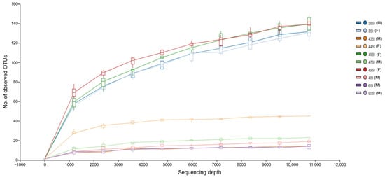 Rarefaction curves showing the number of OTUs per sequencing depth. The sex of the animal is indicated in brackets next to the sample name: F, female; M, male.
